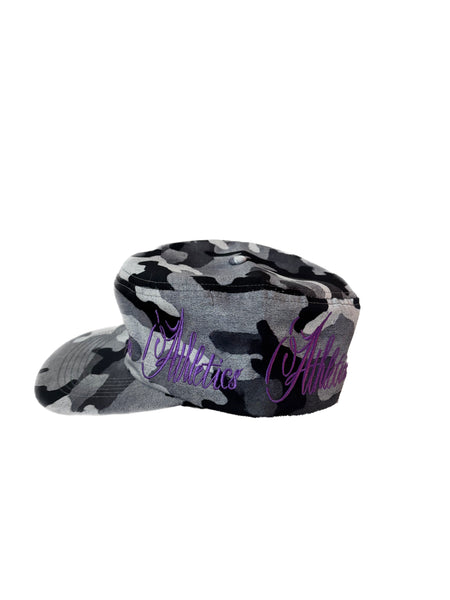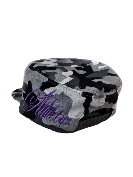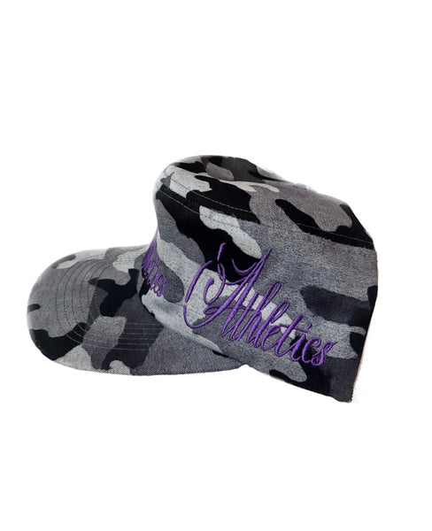 Unisex black, white, grey and purple army camo painters hat. Made with a snapback to fit all and adjustable.